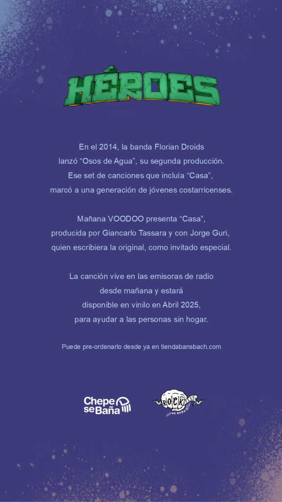 | Si bien Marta Fonseca y Bernal Villegas se habían presentado en Rock Fest III (1998) como 69, una primera versión de Suite Doble, fue a principios de milenio en que dominaron las listas de las emisoras y se volvieron parte de la banda sonora colectiva de Costa Rica. Su canción “Al final” fue usada en un comercial y los ticos la oyeron cientos de veces en los canales de televisión y emisoras no tradicionales para el rock costarricense. La canción se volvió un himno para su generación y favorita en las presentaciones de Fonseca y Villegas. En 2011 la banda Florian Droids lanza su disco homónimo y cambia para siempre el paisaje de la música original costarricense. Liderada por Jorge Guri y Pablo Rojas, Florian rápidamente se populariza y toma la bandera del indie rock en una generación que vuelve a ver un crecimiento en la escena costarricense, pero con bandas como Cocofunka, Percance o Sonámbulo, que expresaban ritmos más latinos. Su segundo álbum “Osos de Agua” (2014) es una joya de colección e incluye“Casa”, una composición de Guri que se vuelve parte de la banda sonora de su generación. En 2025, Pepe Campos y Guido Fernández de la aclamada banda Voodoo hacen suya “Casa”, en una grabación para beneficiar a las personas sin hogar que todos los días van a la Academia de Arte de Chepe se Baña. La canción fue producida en el Estudio Bernal Villegas Soto de Chepe se Baña y Miut Audio por Giancarlo Tassara, con la participación de su creador Jorge Guri y fue masterizada por Mario Miranda. “Escogí ‘Casa’ de Florian Droids porque es una canción que me transmite muchas emociones, me hace pensar, me hace creer y me siento mejor persona al escucharla. Agradezco profundamente a toda la banda y a Jorge Guri por colaborar junto a Voodoo en este hermoso tema que -a mi parecer- es una joya que lleva tiempo de ser un clásico de la música nacional”, dijo Guido Fernández, líder de Voodoo. El disco “Héroes” estará disponible en una edición limitada en vinilo el mes de abril del 2025 y recopilará versiones de himnos del rock costarricense por artistas como Mimayato, HIJOS, Time’s Forgotten, Valeria Atkeys, Uachiman, Mario Maisonnave y Bernal Villegas, entre muchos músicos e ingenieros que colaboraron desinteresadamente. Jorge Guri de Florian Droids, compositor del tema, dijo estar “muy agradecido con Guido de Voodoo por haber tratado la canción con tanto respeto y amor y haberme tomado en cuenta en todo momento, al punto de dejarme grabar algunos teclados y voces para esta versión”. “La música como arte debe ser un ente de transformación y transfiguración, es por eso que este proyecto es importante. Ojalá y haya muchas más iniciativas como estas en el país”, concluyó Guri. |